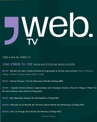 Each live J'Web TV includes 5 to 10 guests from all over France(but not only)in live interview, whose chosen text(unmodified)will be part of one of the following J'Mags!